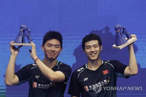 epa10555539 China's Ji Ting He and Hao Dong Zhou celebrate their victory during her men's final at the Madrid Spain Badminton Master after defeating Taiwan's Fang-Chih Lee and Fang-Hen Lee in Madrid, central Spain, 02 April 2023. EPA/SERGIO PEREZ
