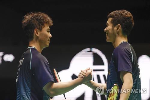 epa10555541 China's Ji Ting He and Hao Dong Zhou celebrate their victory during her men's final at the Madrid Spain Badminton Master after defeating Taiwan's Fang-Chih Lee and Fang-Hen Lee in Madrid, central Spain, 02 April 2023. EPA/SERGIO PEREZ