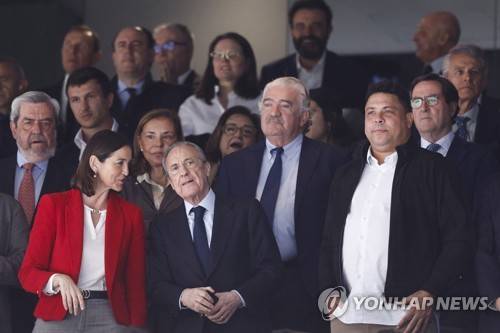epa10555578 Real Madrid's president Florentino Perez (C), Valladolid's president Ronaldo Nazario (R) and PSOE's candidate for Madrid City Council, Reyes Maroto (L), ahead of the Spanish LaLiga soccer match between Real Madrid CF and Real Valladolid at Santiago Bernabeu in Madrid, Spain, 02 April 2023. EPA/Rodrigo Jimenez