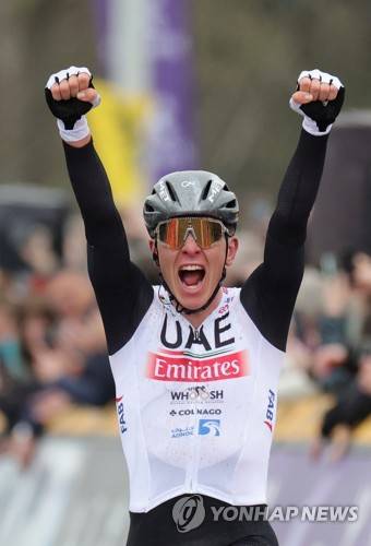 epa10555569 Slovenia's Tadej Pogacar of UAE Team Emirates celebrates as he crosses the finish line to win the Ronde van Vlaanderen (Tour of Flanders) cycling race from Bruges to Oudenaarde, in Oudenaarde, Belgium, 02 April 2023. EPA/OLIVIER MATTHYS