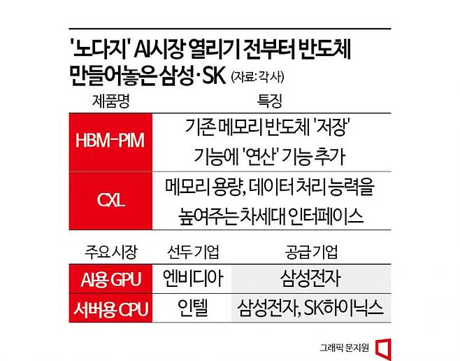 삼성전자와 SK하이닉스는 세계 최고 인텔과 GPU(그래픽처리장치) 기업 엔비디아, AMD 등에 차세대 메모리 반도체를 납품한다. 연산 기능을 대폭 강화한 제품(HBM-PIM), 데이터 처리 속도를 높여주는 저전력 반도체(DDR5 D램), 메모리 용량 및 데이터 처리 능력을 강화하는 인터페이스(CXL) 등을 개발했다.