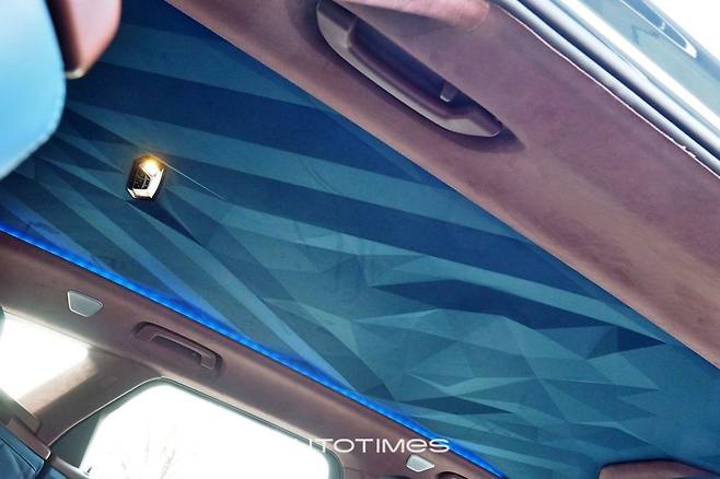 사선으로 디자인한 도어 디자인과 큼직한 수납 공간도 좋다. 화룡점정은 천장이다. 3차원 프리즘 구조를 적용한 알칸타라 소재의 헤드라이너는 100개의 LED를 활용한 조명 효과를 통해 외향적이면서도 진보적인 분위기를 조성한다.