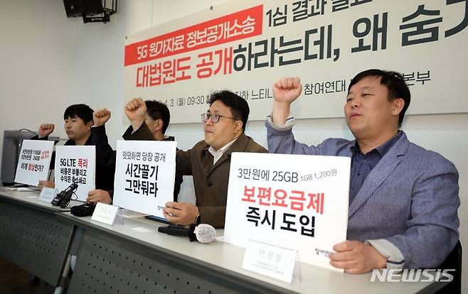 참여연대 민생희망본부는 이날 기자회견에서 ‘5G 원가자료 즉시 공개’, ‘보편요금제 도입과 LTE 요금인하’, ‘요금인가제 재도입과 검증시스템 강화’를 촉구했다.2023.04.03. suncho21@newsis.com