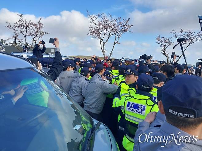 | ▲ 3일 오전 7시 30분경 4.3 75주년 추념식이 열릴 예정인 제주 4.3 평화공원 앞에 서북청년단이 탄 승합차가 나타나자 4.3 유족들이 저지에 나섰다. 이에 경찰이 승합차를 둘러싸고 막고 있다. |