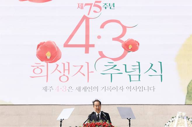 | ▲ 한덕수 국무총리가 3일 오전 제주시 명림로 4·3 평화공원에서 열린 4·3 희생자 추념식에서 윤석열 대통령의 추념사를 대독하고 있다. |