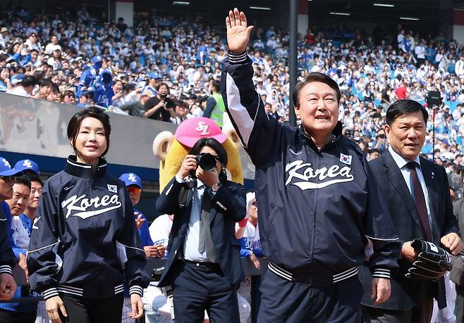 | ▲ 윤석열 대통령과 김건희 여사가 1일 대구 삼성라이온즈파크에서 열린 2023 프로야구 NC 다이노스와 삼성 라이온즈의 개막전에서 시구를 위해 그라운드로 입장하며 관중들에게 인사하고 있다. |