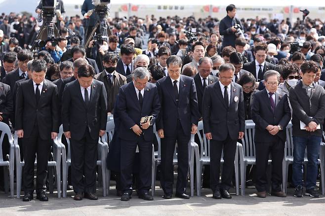 | ▲ 한덕수 국무총리와 참석자들이 3일 오전 제주시 명림로 4·3 평화공원에서 열린 4·3 희생자 추념식에서 묵념하고 있다. 2023.4.3 |