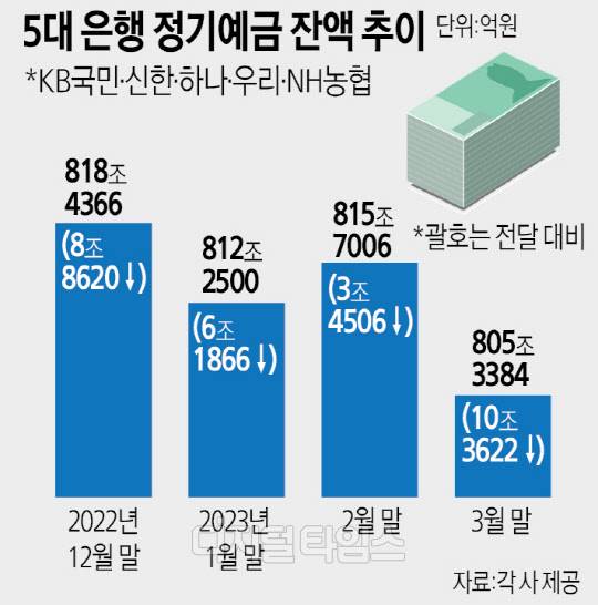 3일 금융권에 따르면 5대 주요 은행(KB국민·신한·하나·우리·NH농협)의 3월 말 정기예금 잔액은 805조3384억원으로 2월(815조7006억원)보다 10조3622억원이 줄었다.