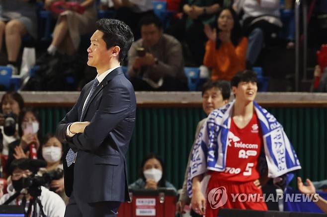 SK 전희철 감독이 미소를 짓고 있다. 오른쪽은 김선형. 2023.4.3
