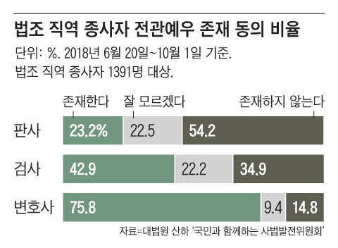 실제로 지난 2018년 10월에 나온 대법원 보고서에 따르면(전관예우 실태조사 및 근절방안 마련을 위한 연구), 법조 관련 종사자 1391명을 대상으로 한 설문 조사에서 검사는 42.9%, 변호사는 75.8%가 전관 예우를 인정했다. 판사들조차 23.2%가 전관 변호사 특혜가 존재한다고 답했다. 검사의 15.9%는 전관 변호사가 개입되면 기소와 불기소 여부가 바뀔 수 있다고 했다. 판사의 13.3%는 전관 변호사가 형사재판의 결론을 바꿀 수 있다고 답했다. 왜 그럴까? 같이 일하던 선후배 관계니까 그렇다.