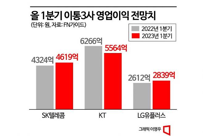 4일 금융정보업체 에프엔(FN) 가이드의 컨센서스(증권사 평균 추정치)를 보면 SK텔레콤·KT·LG유플러스 등 이통3사의 합산 매출액은 14조3933억원으로 전년 동기보다 2.2% 증가했다. 이 기간 영업이익은 1조3022억원으로 전년 동기(1조3202억원)보다 줄었다. SK텔레콤과 LG유플러스의 영업이익은 4619억원, 2839억원으로 각각 6.8%, 8.6% 증가한 것으로 파악된다. 5세대(G) 서비스 가입자 보급률 확대에 따른 무선 통신 사업의 안정적인 성장세가 호실적의 주요 요인으로 꼽힌다. 마케팅 비용의 안정세도 이익에 기여했다는 평가다. 김장원 IBK투자증권 연구원은 "서비스 첫해 2019년 보급률은 휴대폰 가입자만 기준으로 해 8.3%였으며, 4년 만에 보급률이 절반을 넘어섰다"면서 "지난해에 이어 올해도 5G 보급률이 늘고 있고, 통신사가 마케팅 비용을 비롯한 소모적 비용 지출을 억제하고 있어 수익성은 개선될 것"이라고 설명했다. 그러면서 "마케팅 비용은 2021년 8.2조원을 기록한 후 지난해 8조원으로 2.6% 감소했고, 올해도 8조원에 머물 것"으로 전망했다.