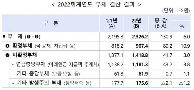 정부가 4일 국무회의에서 심의·의결한 ‘2022회계연도 국가결산’ 보고서에 따르면 지난해 국가부채는 2326조2000억원으로 집계됐다. 전년(2195조3000억원) 대비 130조9000억원(6.0%) 증가했다.