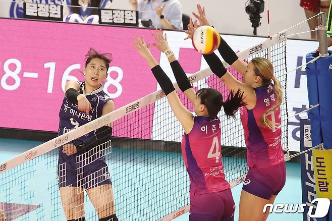 (김천=뉴스1) 공정식 기자 = 4일 오후 경북 김천실내체육관에서 열린 여자프로배구 '2022-2023 V리그 챔피언결정전' 한국도로공사 하이패스 배구단과 흥국생명 핑크스파이더스의 4차전 경기, 도로공사 박정아가 공격하고 있다. 2023.4.4/뉴스1