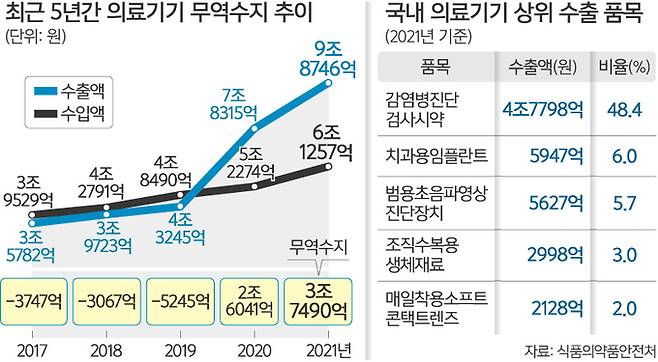 이를 위해 민간과 정부는 5년간 R&D 투자를 10조원까지 확대한다. 국내 생산·수출 규모가 큰 체외진단기기, 영상진단기기, 치과재료 등 주력 분야 지원을 늘리기로 했다. 코로나19 사태를 겪으며 급성장한 체외진단기기 분야 중 감염병 진단검사시약은 우리 수출의 절반 가까이(48.4%) 차지하고 있다.