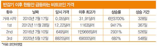 실제 반감기 전후로 비트코인 가격은 크게 올랐다. 두 번째 반감기였던 2016년 7월 9일. 660달러였던 비트코인 가격은 연말 1000달러를 돌파, 1년 뒤인 2017년 7월 9일에는 2570달러를 기록했다. 랠리는 2017년 12월(1만9666달러)까지 526일 가까이 지속됐다. 세 번째 반감기 때도 비슷한 양상이 나타났다. 2020년 5월 11일 비트코인 가격은 연말 2만3000달러까지 치솟았다. 최고점은 2021년 11월 기록한 6만9000달러다. 랠리 지속 기간은 이전 반감기와 비슷한 548일이다.