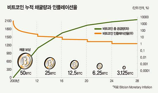 하지만 2009년 이후 지금까지 14년이 지난 현재도 여전히 채굴할 코인이 남아 있다. 비트코인을 창시한 사토시 나카모토가 ‘반감기’라는 구조를 만들어놨기 때문이다. 그는 약 4년에 한 번, 정확히 말하면 블록 21만개가 생겨날 때마다 한 번씩 채굴 보상을 ‘절반’으로 줄이기로 했다. 블록 생성을 위해 풀어야 할 문제 난이도를 2배로 늘리는 방식을 통해서다. 예를 들어 문제가 ‘1부터 1억 중 특정 숫자 1개를 찍어서 맞히시오’라고 한다면 반감기 이후에는 범위를 2억까지 확대하는 식이다.