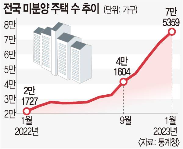 4일 통계청에 따르면 2021년 초 2만 가구에 못 미쳤던 전국 미분양 주택 수는 올해 1월 7만5400가구로 4배 가까이 증가했다. 시공사와 프로젝트 파이낸싱(PF)을 내준 금융사에 직접적인 부담이 되는 ‘준공 후 미분양’ 주택도 전국 8600가구로 집계돼 전월 대비 1000가구(13.2%)나 증가했다.