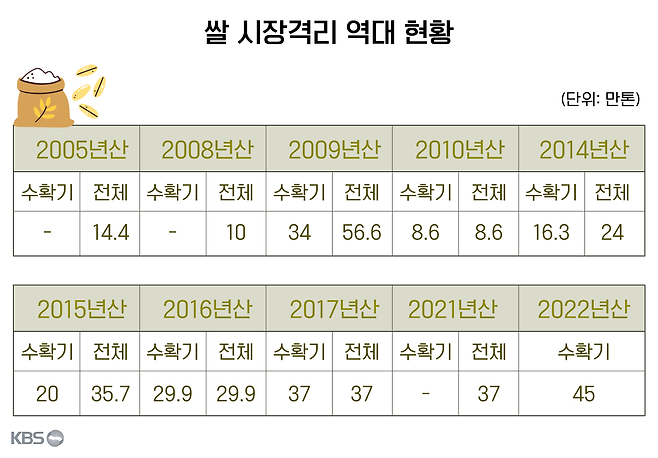 하지만 애매한 기준이었습니다. 문제는 2021년 가을에 터집니다. 쌀값 급락 조짐이 있는데도 정부는 어찌된 일인지 꿈쩍도 안 합니다. (양곡법엔 10월 15일까지 정부가 매입 계획을 세워야 한다고 되어 있었습니다) 우물쭈물 대더니 민주당(당시 여당)과 당정 협의를 거쳐 12월에야 20만 톤을 격리하겠다는 계획을 내놓습니다. 실제 매입 절차는 해를 넘겨 2022년 1월 말에서야 시작됩니다. 적기를 놓친 뒤였습니다. 결국 지난해 9월, 쌀값은 1년 만에 26% 떨어져 45년 만의 최대 하락 폭을 기록했습니다.