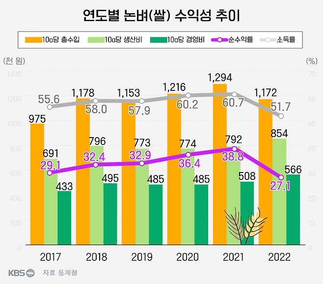 그러는 사이 지난달 30일 통계청은 지난해 10a당 벼농사 순수익이 31만 7,000원으로, 1년 전(50만 2,000원)에 비해 36.8% 감소했다고 발표했습니다. 논벼 순수익률은 27.1%로, 쌀 농가가 100만 원을 벌었을 때 실제 손에 쥐는 돈은 27만 원에 불과하다는 의미입니다. 쌀값은 떨어졌지만 비룟값은 대폭 오른(71.4%↑) 영향입니다. 농가 소득을 안정시키려면 생산 조정 등 다양한 정책 수단이 있는데 '의무매입' 논쟁에 매몰돼 적절한 대응을 놓쳤다는 비판이 나옵니다.