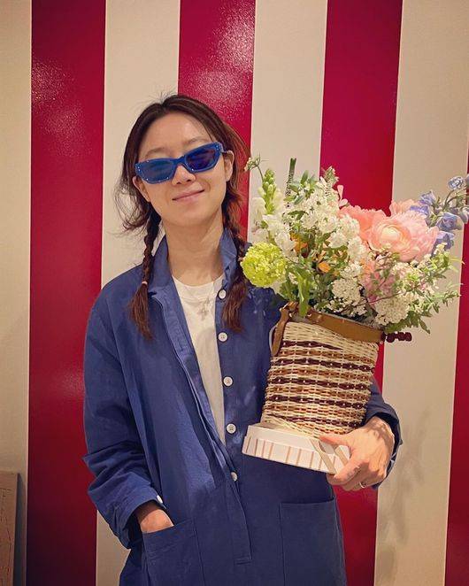 공효진은 화사한 꽃선물을 품에 안고 환하게 미소 지으며 행복하게 생일을 만끽하고 있다.