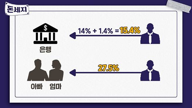 ◆ 엄해림> 이자소득세를 내면 조금 더 우리가 차용을 나중에 주장할 때 유리하기는 해요. 우리가 은행에서 받는 이자는 원청 진수가 14%에 1.4% 더해서 15.4%가 되는데 부모님과의 돈 거래 이런 경우에는 27.5%에 해당하는 원천 징수를 하셔야 돼요.