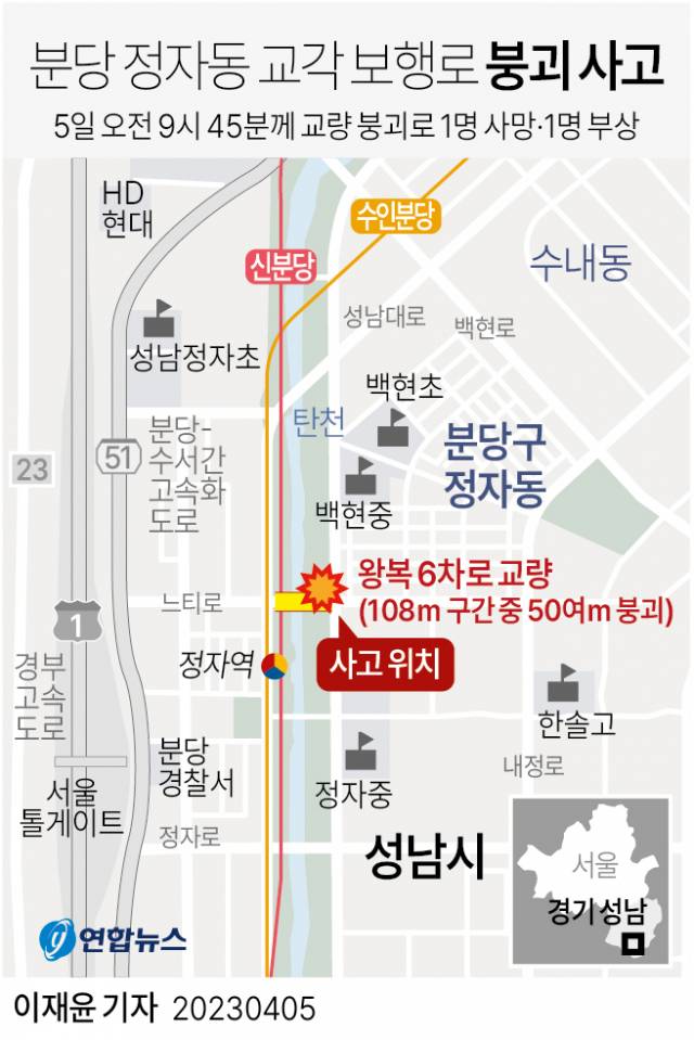 이번 사고는 이날 오전 9시 45분께 성남시 분당구 정자동에서 탄천을 가로지르는 교량인 정자교의 한쪽 보행로가 무너져 내리면서 발생했다.