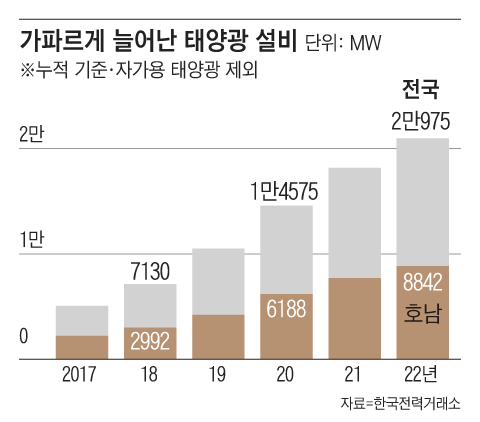5일 산업부와 한전, 전력거래소에 따르면 2016년 말 전국적으로 3716MW에 그쳤던 태양광 발전 설비는 올 4월 2만1981MW로 급증했다. 우리나라 전체 태양광의 40%를 넘게 차지하는 호남 지역에선 같은 기간 1751MW에서 9371MW로 급증했다. 자가용 태양광까지 더하면 전국 태양광 설비는 26.4GW로 우리나라 원전 전체 설비 용량(24.65GW)을 웃돈다.