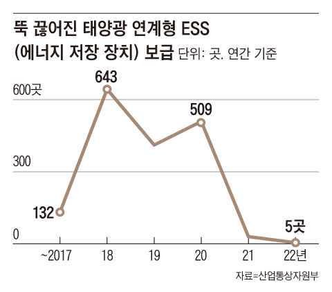 태양광이 폭증한 2019년 이후 전남 지역에서 도(道) 바깥으로 확충된 송전 선로는 없고, 태양광발전의 필수 설비로 꼽히는 ESS도 지난해 1년 동안 5곳, 1MWh가 늘어나는 데 그쳤다. 한 태양광 업체 대표는 “ESS 관련 화재 사고가 계속되다 보니 투자를 하고 싶어도 보험을 들 수도, 은행 대출을 받을 수도 없다”고 말했다.