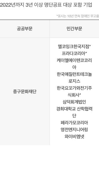 참고로 지난해 고용노동부는 10년 연속 장애인 고용의무를 이행하지 않은 기업을 공개했는데 무려 74곳이나 된다. 이 중 프라다코리아 등 3개 기업은 10년 연속 장애인을 한 명도 고용하지 않았다. 아무리 명단에 자주 올라도 기업 차원에서 '불명예'일 뿐 실효성 있는 제재 수단이 없다는 것이 맹점이다. 이부용 고용노동부 장애인고용과장은 "명단 공표 대상 기업이 워낙 많아 주목도가 떨어지는 부작용이 있다" 고 말했다.