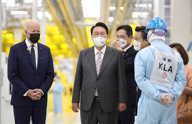 | ▲ (평택=연합뉴스) 안정원 기자 = 취임 후 한국을 첫 방문한 조 바이든 미국 대통령이 윤석열 대통령과 20일 오후 경기도 평택시 삼성전자 반도체공장을 방문, 이재용 부회장의 안내를 받으며 공장을 시찰하고 있다. 2022.5.20 |