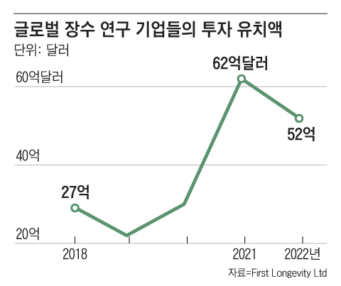 영국 미디어 회사 ‘퍼스트 롱제비티’에 따르면, 지난해 전 세계 장수 연구 기업들의 투자 유치액은 52억달러(약 6조8000억원)에 달했다. 큰손들의 투자가 이어지면서 노화를 거스를 수 없는 숙명으로 여겨왔던 인식도 변하는 분위기다. 노화 연구의 세계적 권위자인 데이비드 싱클레어 하버드대 의대 교수는 작년 6월 한 행사에서 “언젠가는 의사에게 가서 10년을 되돌릴 수 있는 약물을 처방받는 일이 일상이 될 것”이라고 했다.