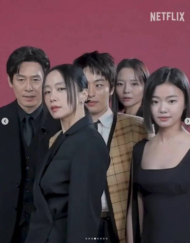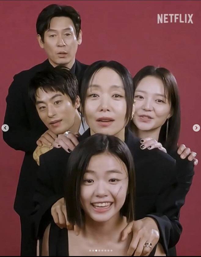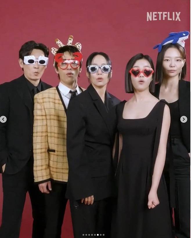 6일 넷플릭스 영화 '길복순'(감독 변성현)의 타이틀롤 전도연은 함께 출연한 킬러 역할의 배우들과 함께 단체샷을 촬영했다.