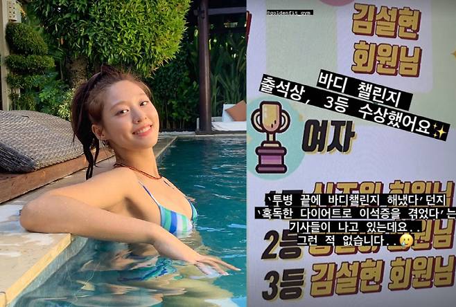 설현은 6일 "보디 챌린지 출석상, 3등 수상했어요"라고 자랑하면서도 "'투병 끝에 보디 챌린지 해냈다' 든지 '혹독한 다이어트로 이석증을 겪었다' 기사들이 나고 있는데요. 그런 적 없습니다"라고 정정했다.
