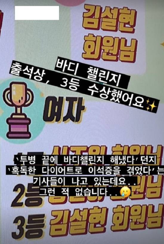 6일 설현은 "바디 챌린지 출석상, 3등 수상했어요"라며 자신이 헬스장에서 개최한 대회에 수상했음을 밝혔다.