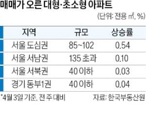 고준석 제이에듀투자자문 대표는 "수요가 많은 전용 59㎡와 84㎡는 아직 매수자와 매도자의 치열한 눈치싸움이 전개돼 매매가 위축되고 있다"면서도 "갈아타기를 시도하려는 1주택자나 임대 목적으로 소형 면적 아파트를 구입하려는 다주택자는 지금 가격을 적기라고 보는 경향이 있어 일부 초대형·초소형 아파트값이 오른 것으로 보인다"고 말했다.