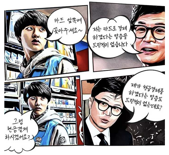 두 사람의 대화의 앞부분만 보면, 편의점 직원이 "카드 앞쪽에 꽂아주세요"라고 하자 한 장관이 "저는 카드로 결제하겠다는 말씀을 드린 적이 없습니다"라고 답하고요, 편의점 직원이 다시 "현금결제 하시겠어요?"라고 묻자 한 장관은 "제가 현금결제를 하겠다는 말씀도 드린 적이 없는데요?"라고 말하는 식입니다.