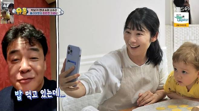 이를 VCR로 본 장신영은 "저도 가도 되나"라고 물었고 소유진은 "(아들) 정우 데리고 오시라. 저희 집 할 게 많다"며 흔쾌히 초대했다. (사진=KBS 2TV '슈퍼맨이 돌아왔다' 캡처)
