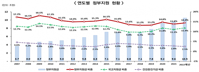 정부의 지원금을 주목하는 이유는, 그동안 건강보험 정부지원금은 법적 기준보다 적게 지원됐기 때문이다. 지난해의 경우 14.4%(10조5000억원). 2021년에 13.8%(9조6000억원) 가량만 지급됐다. 정부 지원금이 과소 지급되는 것은 그동안 계속된 현상이다. 이는 정부가 법적 기준인 20% 모두 지원하지 않아도 건강보험이 제 기능을 한다는 것을 반증한다. 또 법적 기준만 충족시켜도 어느 정도 지출 부담을 건강보험을 감당할 수 있는 재정 여건을 갖추고 있다는 점이다.