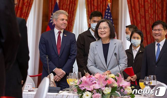(타이베이 로이터=뉴스1) 우동명 기자 = 차이잉원 대만 총통이 8일(현지시간) 타이베이를 방문한 마이클 매콜 미국 하원 외교위원장과 오찬에 참석해 포즈를 취하고 있다.
