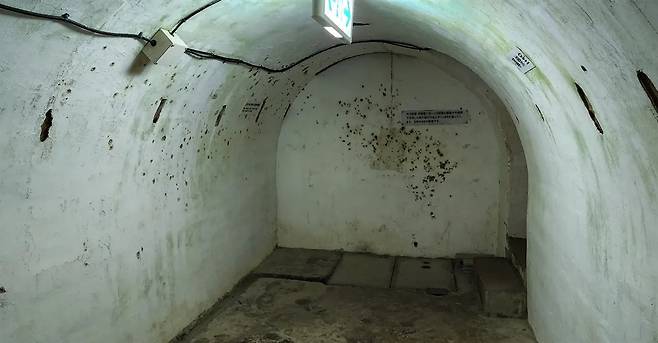 | ▲ 오키나와 구 해군사령부호의 수류탄 폭발 흔적 해군의 고급장교들은 이 방에서 수류탄으로 집단자결했다. |