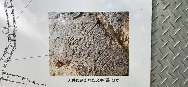| ▲ 육군병원 하에바루호군 20호의 천장에 남은 조선인 병사의 흔적 천장을 바라보고 누워있던 조선인 부상병이 자신의 성인 '강'을 한자로 새긴 것으로 전해진다. |