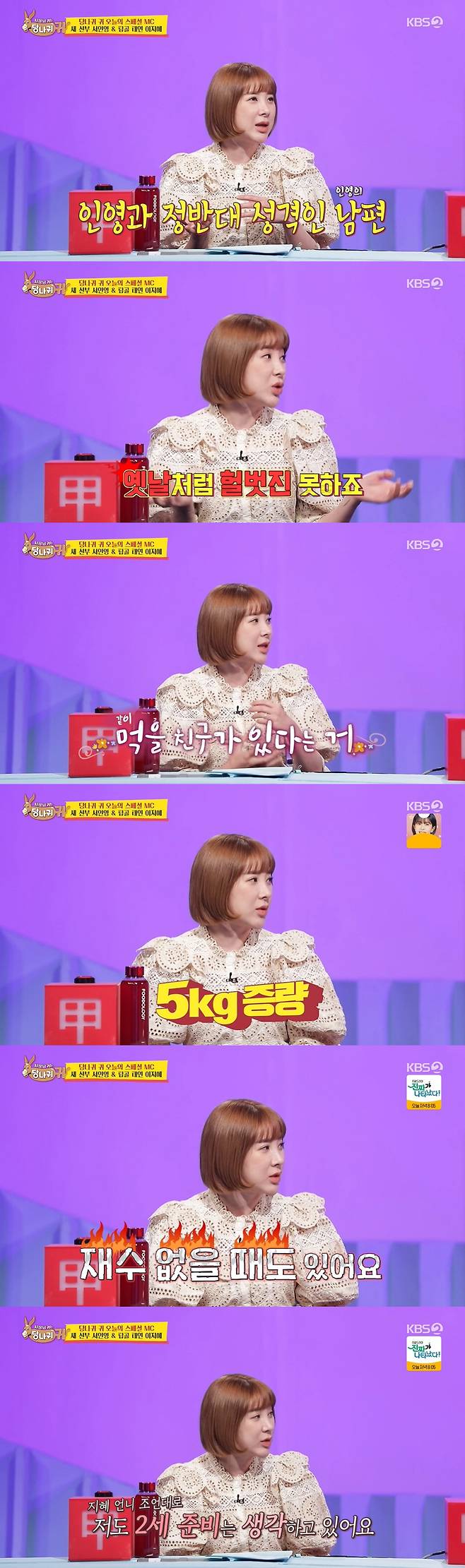 서인영은 결혼하고 가장 좋은 점을 묻는 질문에 "야식을 함께 먹을 수 있는 친구가 있다는 것"을 꼽으면서도 "안 좋은 점은 살이 찐다. 5kg가 쪘다"며 신혼의 소소한 즐거움을 만끽하고 있는 근황을 전했다.