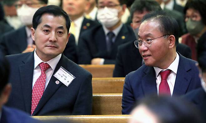 | 박대출 정책위의장과 대화하는 尹원내대표 국민의힘 윤재옥 신임 원내대표(오른쪽)와 박대출 정책위의장이 9일 서울 중구 영락교회에서 열린 한국교회 부활절 연합예배에서 예배 시작에 앞서 대화하고 있다. 뉴시스 |