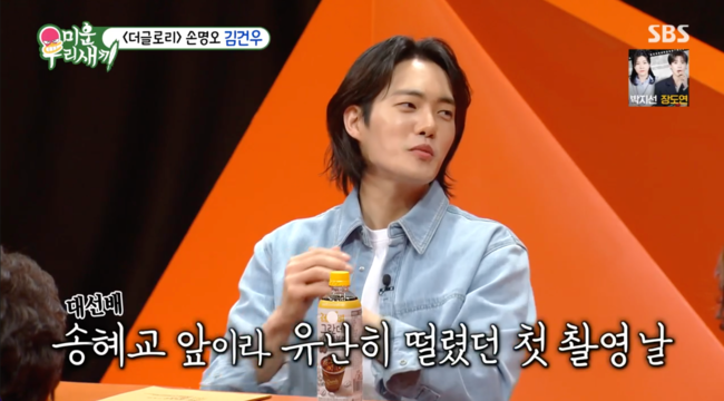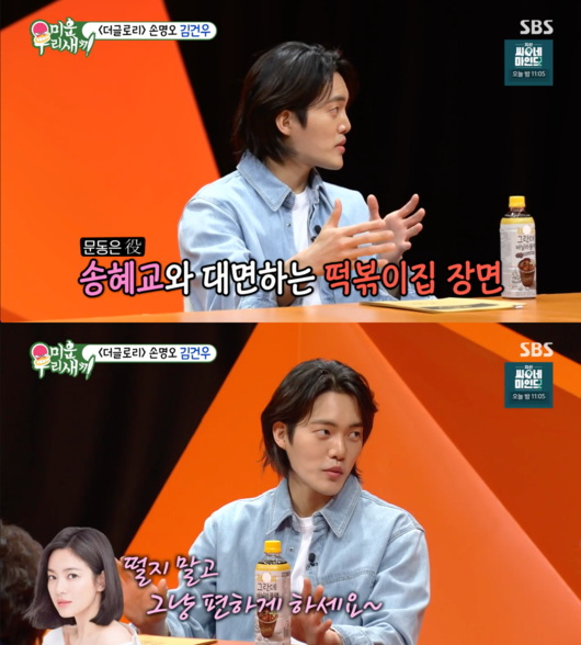 송혜교 때문에 힘들었다는 얘기가 있다는 말에 김건우는 “혜교 누나 때문에 힘든 건 없었고 첫 촬영, 첫 씬이 떡볶이집에서 갈등을 빚는 씬이었다. 너무 긴장을 했다. 누나가 ‘떨지 말고 그냥 편하게 하시라’고 했다. 너무 감사했다. 하필 누나와 함께 하는 첫 씬이라 힘든 날이었다”라고 설명했다.