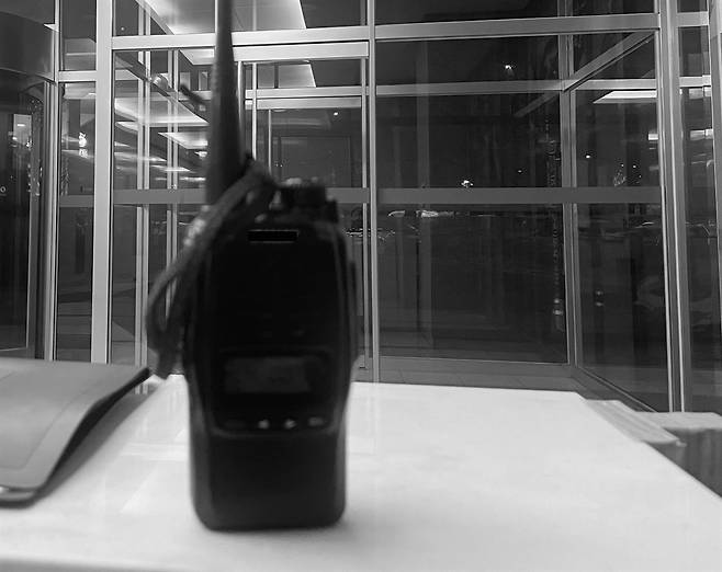 | ▲ 늘 함께하는 무전기 경비원은 새벽에도 근무 내내 감시한다. |