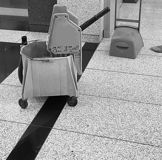 | ▲ 청소도 과학이다 걸레를 빨기 위해서 가지고 다니는 물통. 청소하는 모습을 옆에서 지켜보면 ‘청소도 과학’이라는 이분의 말에 공감된다. |