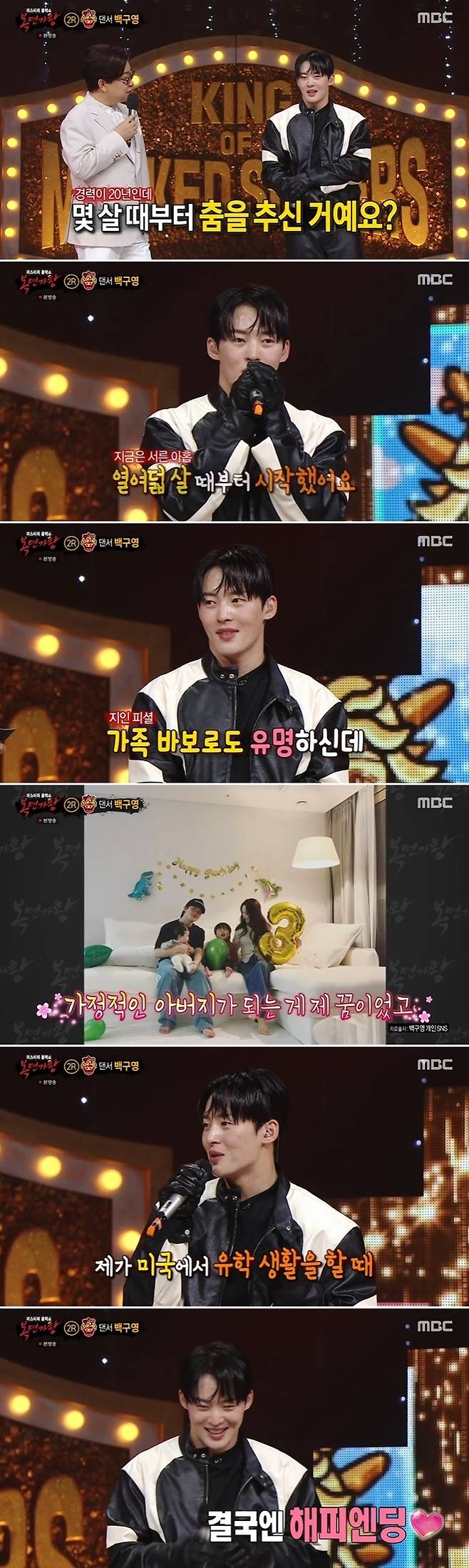 18살 때부터 춤을 췄다는 백구영은 현재 39살, 두 아이의 아버지이기도 하다. 백구영은 "어렸을 때부터 가정적인 아버지가 되는 것이 제 꿈이었다"며 "아내가 일본 사람이다. 제가 미국에서 유학 생활을 할 때, 관광 온 아내를 만나게 됐다"고 말하기도 했다.(사진=MBC '복면가왕' 방송 캡처)