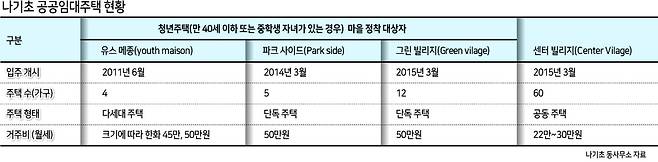 정주 촉진 주택인 센터빌리지나기를 제외한 세 임대주택은 청년주택으로 분류돼 40세 이하, 또는 자녀가 중학생 이하의 나이인 부부가 거주 가능한 게 특징이다. 자녀 나이 기준은 첫째 아이가 아닌 마지막에 낳은 자녀 기준이므로 아이를 더 낳을수록 임대주택에 오래 살 수 있도록 설계됐다.