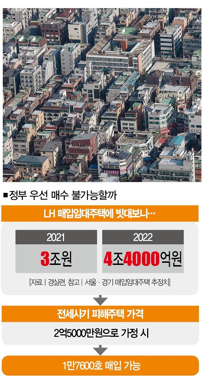 정부가 문제의 주택을 우선 매수하는 데 정부가 파산할 정도로 과한 비용이 드는 것도 아니다. 경제정의실천시민연합에 따르면 2021년, 2022년 한국토지주택공사(LH)가 서울ㆍ경기 매입임대주택에 투입한 추정 비용은 각각 3조원, 4조4000억원에 달했다.