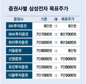 증권사들은 이날 삼성전자 목표주가를 경쟁적으로 상향했다. △IBK투자증권 8만원→9만원 △BNK증권 7만7000원→8만7000원 △하이투자증권 7만5000원→8만3400원 △키움증권 7만8000원→8만원 △신영증권 7만6000원→7만9000원 △유진투자증권 7만2000원→7만8000원 △다올투자증권 7만1000원→7만5000원 등이다. 7만 전자를 넘어 9만 전자까지 넘볼 수 있다는 전망까지 나왔다.